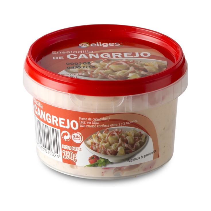 Sucedáneo de CANGREJO (40%) [agua, SURIMI (32.5%) (carne de PESCADO blanco (93,7%), azúcar, estabilizantes (E451i, E450iii)), almidón de patata, aceite de colza, azúcar, sal, almidón modificado, proteína de SOJA, CLARA de HUEVO en polvo, potenciador del sabor (E-621), aromas de CANGREJO (CRUSTÁCEOS), carne de CANGREJO (0,1%) (CRUSTÁCEOS) y colorantes, (E-120, E-160c)], Salsa (aceite de oliva, agua, azúcar, vinagre de vino, YEMA de HUEVO pasteurizada, sal, tomate concentrado, antioxidantes (glucodeltalactona, ácido cítrico y EDTA cálcico disódico), vino aromatizado, aroma de whisky, espesantes (goma xantana y goma guar), y conservadores (sorbato potásico y benzoato sódico)), piña (23%) [agua, azúcar, antioxidante (E-300), acidulante (E-330)] y HUEVO cocido (4%) (sal, acidulantes (E-330, E-260)).